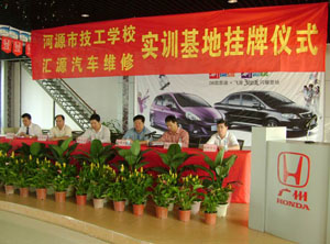 10月26日上午,河源市技工學(xué)校匯源汽車銷售公司實(shí)訓(xùn)基地掛牌儀式在匯源汽車銷售公司舉行。河源市技工學(xué)校100多名師生、匯源汽車銷售公司部分員工參加了掛牌儀式。市委常委、市政府副市長楊耀初同志,市政府邱榮輝副秘書長,及市勞動保障局等部門領(lǐng)導(dǎo)出席了掛牌儀式。掛牌儀式由市勞動保障局歐繼勝副局長主持,匯源集團(tuán)賴運(yùn)宏董事長在掛牌儀式上致詞,市技工學(xué)校歐陽仕文校長發(fā)表講話。最后,楊耀初副市長作了重要講話。楊副市長充分肯定了匯源汽車銷售公司與市技工學(xué)校的合作,高度贊揚(yáng)了匯源汽車銷售公司勇?lián)鐣?zé)任、充滿愛心的企業(yè)精神;希望校企繼續(xù)努力,更快、更好地為社會培養(yǎng)更多、更優(yōu)的有用人才!