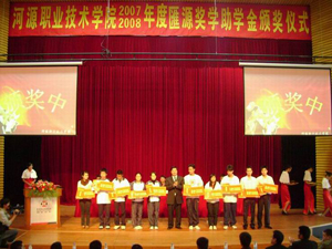 2008年11月27日下午,河源職業(yè)技術(shù)學(xué)院舉行2007、2008年度?R源獎學(xué)助學(xué)金頒獎儀式,給予獲得2007、2008年度獎學(xué)助學(xué)金的60名品學(xué)兼優(yōu)且家庭經(jīng)濟(jì)比較困難的學(xué)生頒發(fā)了獎金。河職院劉安華院長在頒獎儀式上介紹了匯源獎學(xué)助學(xué)金情況。他說:在2005年,匯源集團(tuán)為我校出資30萬元設(shè)立“匯源獎學(xué)助學(xué)金”,每年資助名額為30人,資助標(biāo)準(zhǔn)為每人1000元,用于激勵品學(xué)兼優(yōu)、家庭貧困的學(xué)生。匯源獎學(xué)助學(xué)金寄托了匯源集團(tuán)對青年大學(xué)生的深厚感情和殷切期望!獲獎學(xué)生代表在儀式上作了學(xué)習(xí)經(jīng)驗發(fā)言,并衷心感謝匯源集團(tuán)和河職院的支持與教育。匯源集團(tuán)賴運宏董事長參加了頒獎儀式并在儀式上講了話,他感謝河職院全體師生們的努力付出和積極參與,希望獲獎學(xué)生樹立助人為樂精神,勤奮學(xué)習(xí),把好的思想和精神充分落實到今后的社會實踐之中,共同為創(chuàng)建和諧社會而努力!"匯源獎學(xué)助學(xué)金"在2006年舉行了第一次頒獎儀式。