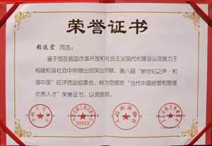 2008年11月29日,由中國文化報社、中華全國工商聯(lián)宣教部、人民政協(xié)報社、中國.北京法制文學(xué)研究會共同主辦的第八屆“新世紀(jì)之聲.和諧中國”評選表彰大會在北京人民大會堂隆重舉行。匯源集團(tuán)賴運(yùn)宏董事長榮獲“當(dāng)代中國經(jīng)營和管理優(yōu)秀人才”光榮稱號。此項(xiàng)評選活動自2008年5月份開始在全國范圍內(nèi)開展,歷時5個月,評選出一批在我國改革開放和社會主義現(xiàn)代化建設(shè)以及致力于構(gòu)建和諧社會中做出突出貢獻(xiàn)的人士。