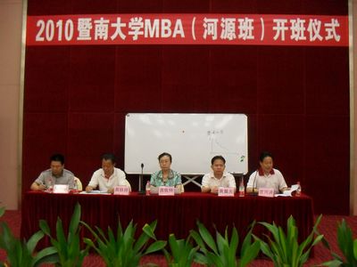2010年6月11日,暨南大學(xué)(河源)MBA班在匯源集團(tuán)多功能廳舉行開(kāi)班儀式。市委龔佐林副書(shū)記、市人大黃晨光副主任、市政協(xié)具鐵祥副主席參加了開(kāi)班儀式。據(jù)悉,此次MBA班226多名學(xué)員,來(lái)自河源市、縣非公企業(yè)、國(guó)有企業(yè)、金融系統(tǒng)。